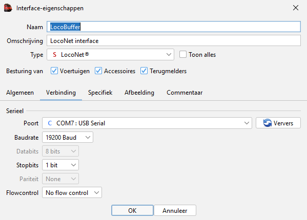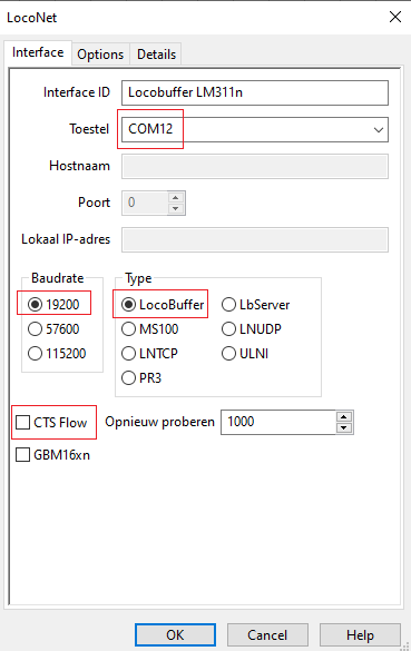 - Kies de juiste COM-poort via welke het basis board LocoBuffer met de