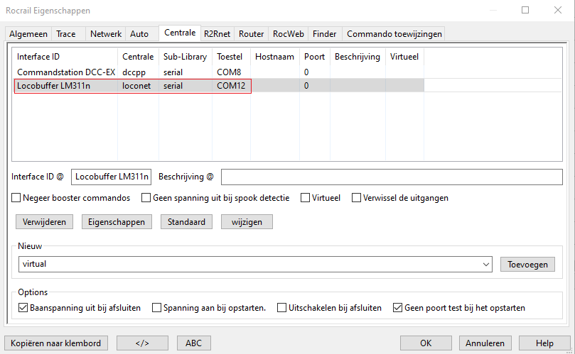 Maak in Rocrail een centrale aan van het type 'LocoNet':