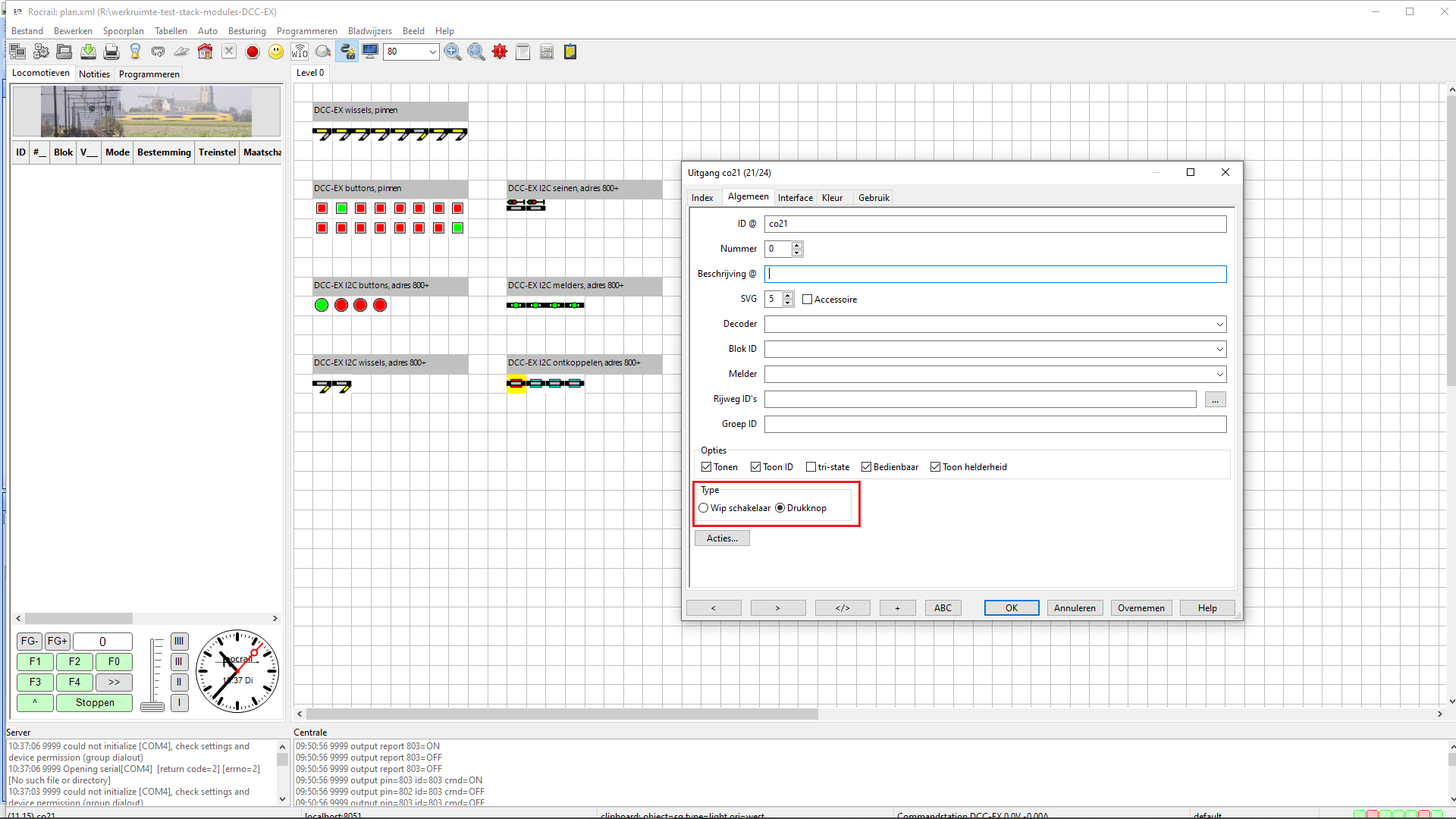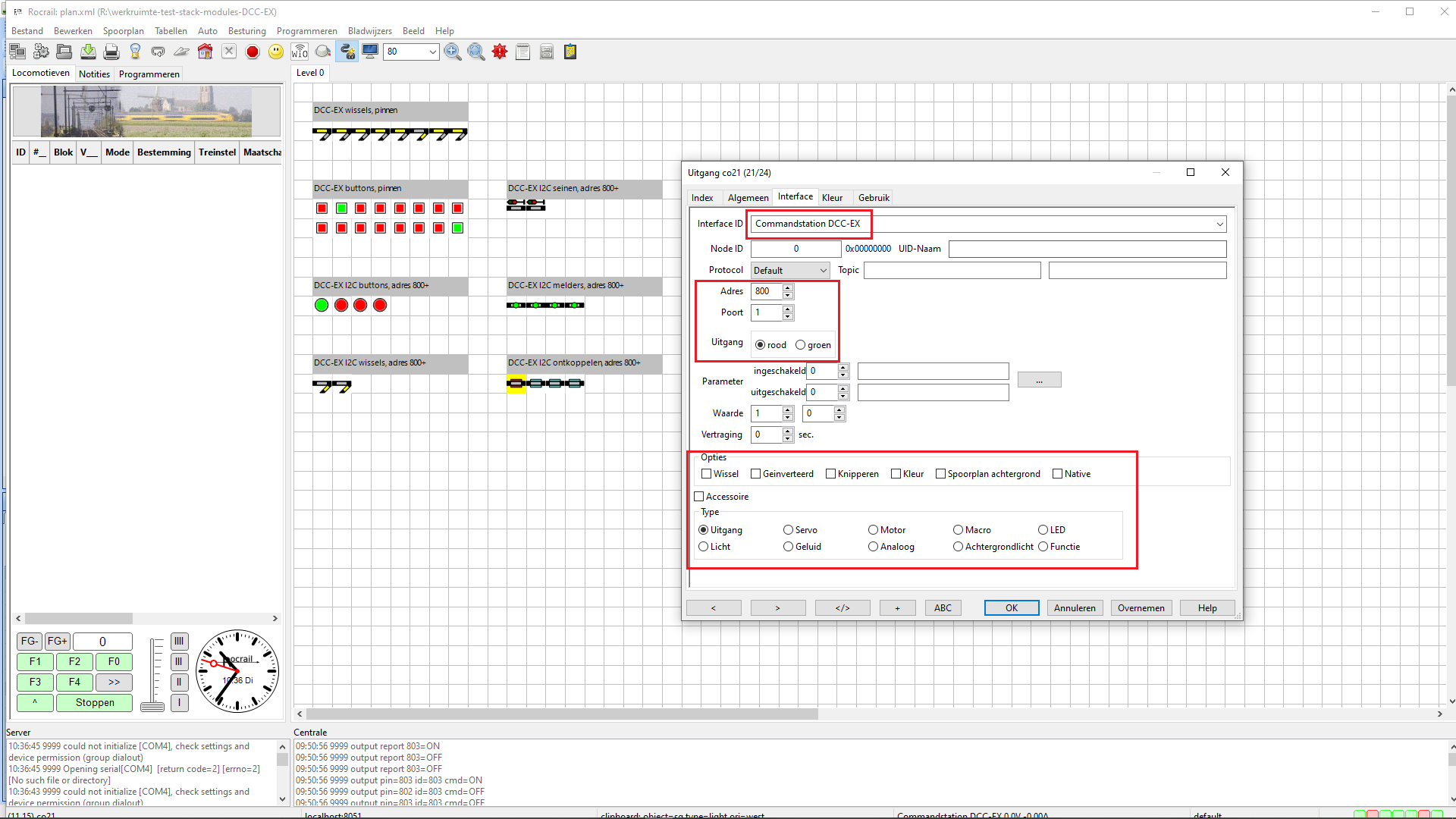 Klik op de afbeeldingen voor configuratiesettings in Rocrail (afbeeldingen