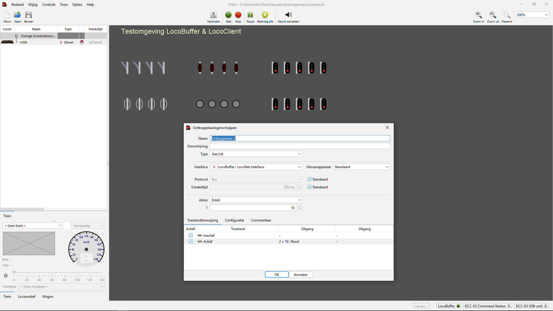 Configureer in Rocrail de ontkoppelaars als volgt: