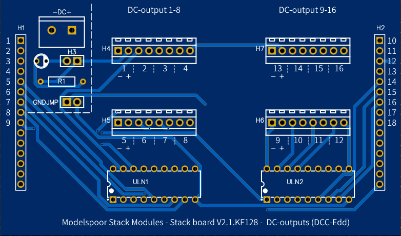 Stack board voor sturing van 16 DC-outputs (maximaal 500ma per kanaal).