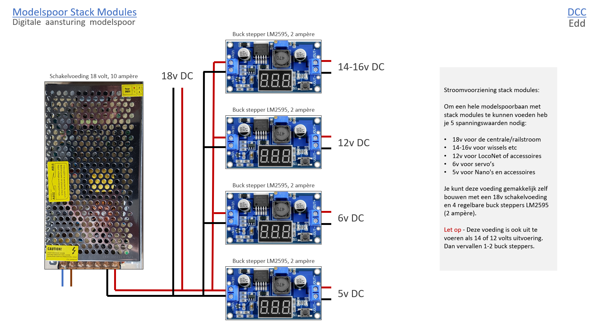 Integrale voedingOm een hele modelspoorbaan met stack modules te kunnen voeden heb je meestal 4 spanningswaarden nodig. 18v voor de digitale centrale (railstroom), 14-16v voor wissels etc, 12v voor LocoBuffer en LocoClients en 5v voor Nano's en accessoires (bv relais, servo's, pins en led's). De voeding wordt geleverd zonder 220v snoer/steker. Let op - Bij sommige systemen (bv Märklin Z-spoor) is de gebruikte spanning lager dan 18v (nl 12v). Check dat tevoren even goed! Er bestaan ook 14v systemen in N-spoor. We kunnen deze voeding dus ook in die lagere spanningen leveren!